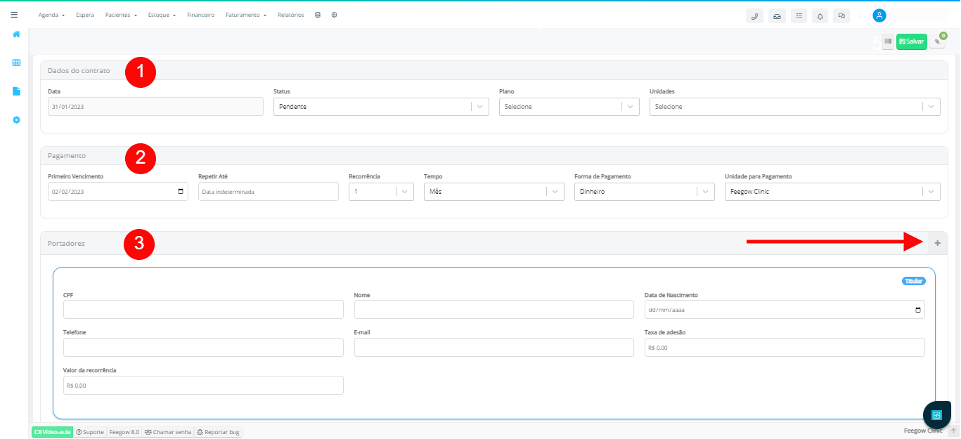 Depois de cadastrar os Planos e configurá-los, é possível cadastrar os Contratos.