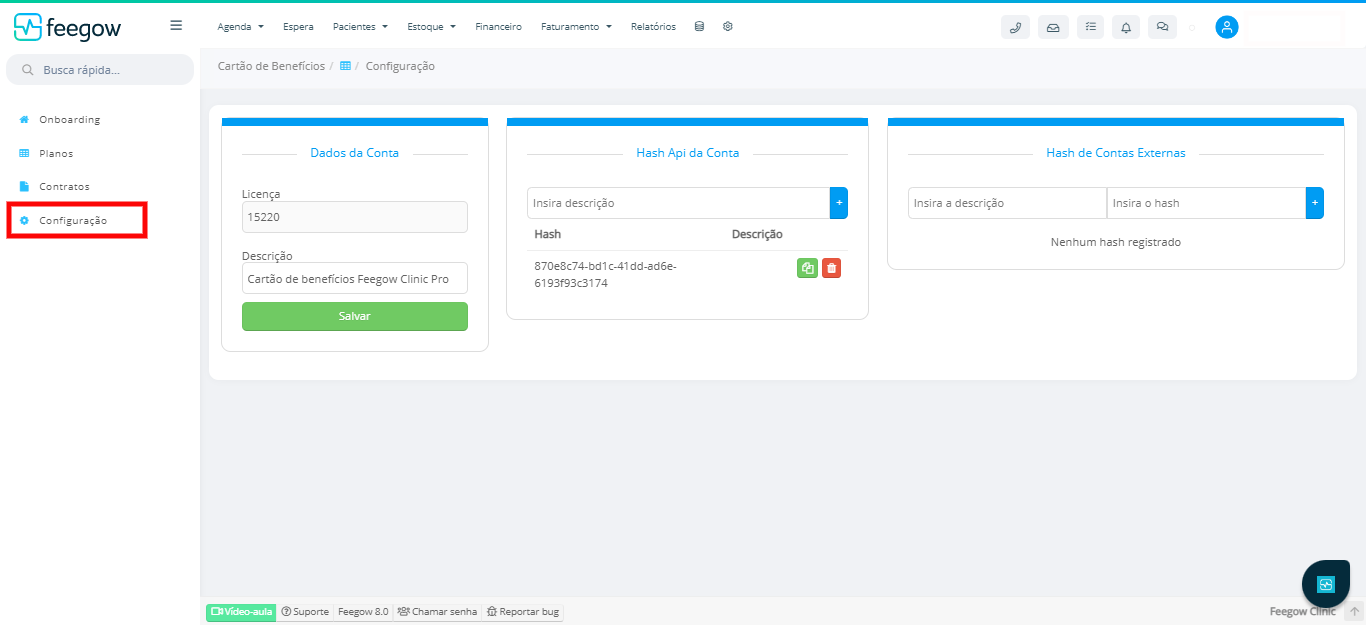 - Em Hash API da Conta é para gerar um token para que seja possível consumir o EndPoint do Cartão de Beneficios (Por exemplo: visualizar pacientes, matriculas, valore a pagar, valores pagos e em aberto).