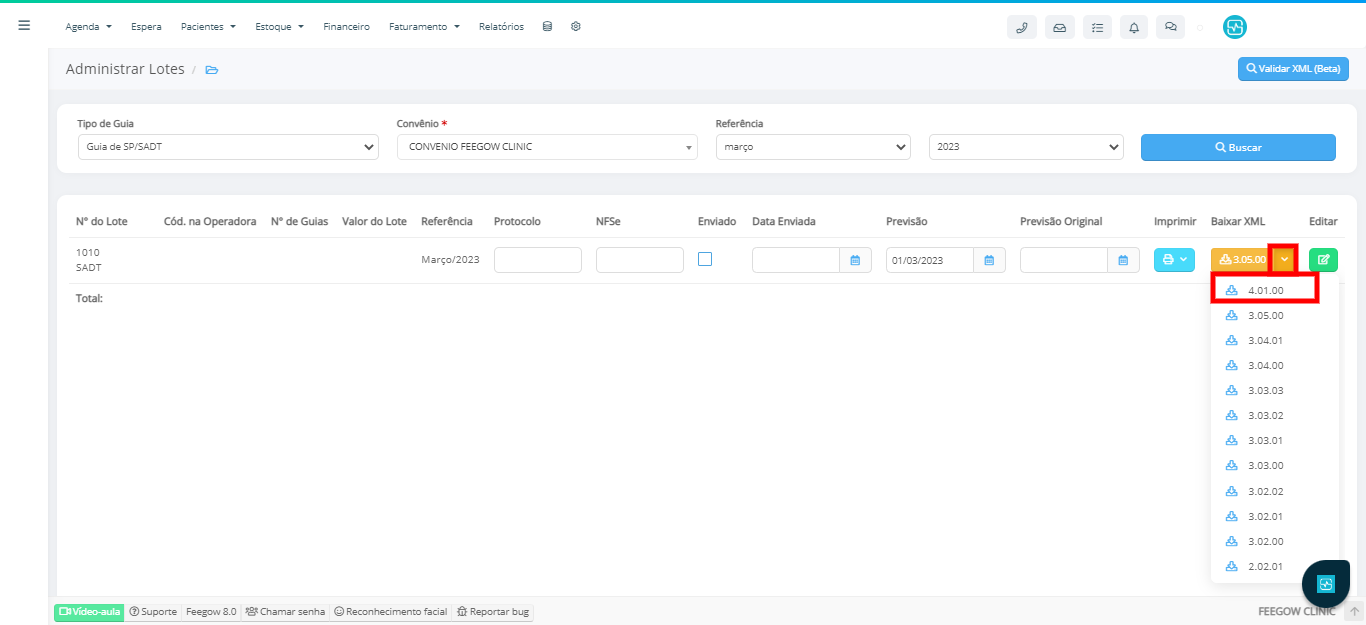 - Em Faturamento > Administrar Lote > Buscar pelo tipo de guia, pelo convênio e mês e ano de referência > No menu de versões do XML a opção estará listada.