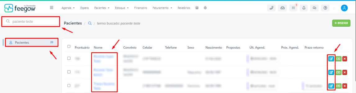 Para editar o cadastro basta clicar no próprio nome do paciente ou no ícone azul com o lápis em destaque acima. Dessa forma, será redirecionado para o cadastro, onde poderá alterar as informações. Após fazer as alterações, basta clicar novamente em Salvar.