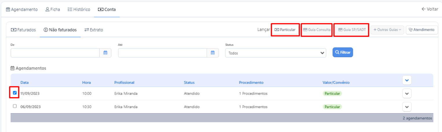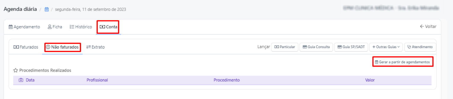 Acesse o agendamento do paciente -> clique na aba "Conta" > "Não faturados" > Gerar a partir de agendamento, selecione a data do atendimento, em seguida, clique em "Particular " ou "Gerar guia de consulta ou "SADT", dependendo da forma de pagamento selecionada no agendamento.