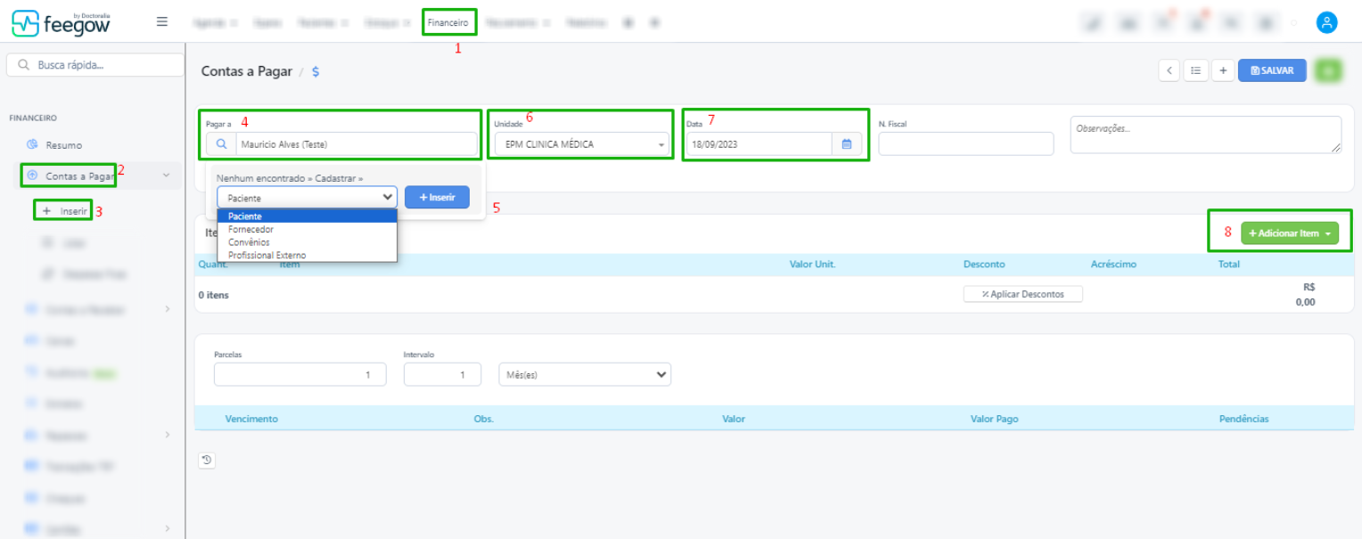 Observação: "Ao preencher o campo 'Pagar a', o sistema fornecerá automaticamente uma lista de opções caso o nome já tenha sido cadastrado anteriormente. Se o nome não estiver cadastrado, você terá a opção de inseri-lo manualmente, especificando se é um paciente, fornecedor, convênio ou profissional externo."