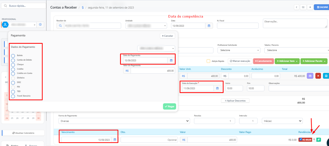 Após o lançamento, é necessário realizar a alteração nas datas de competência, execução, vencimento e pagamento - salve as modificações e em seguida, clique na opção para receber.