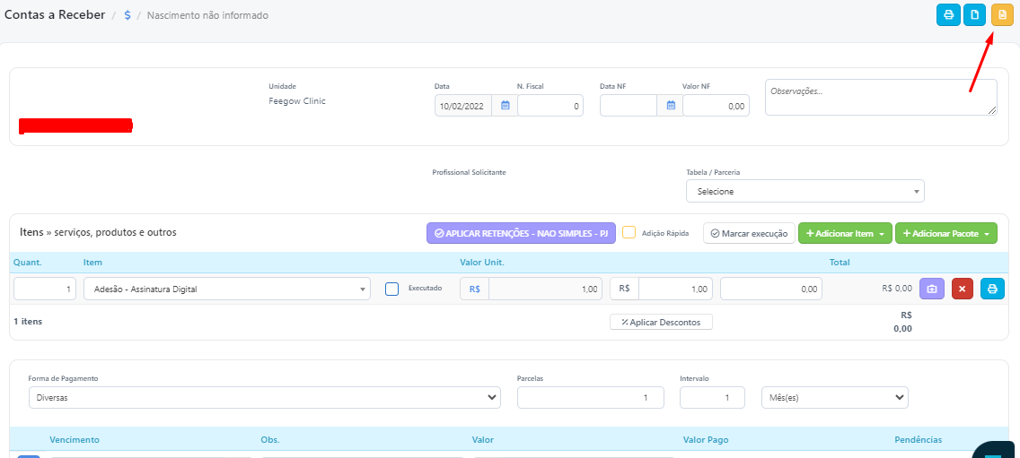Para emitir uma nota fiscal entre na conta do paciente e clique no ícone laranja na parte superior direita da tela: