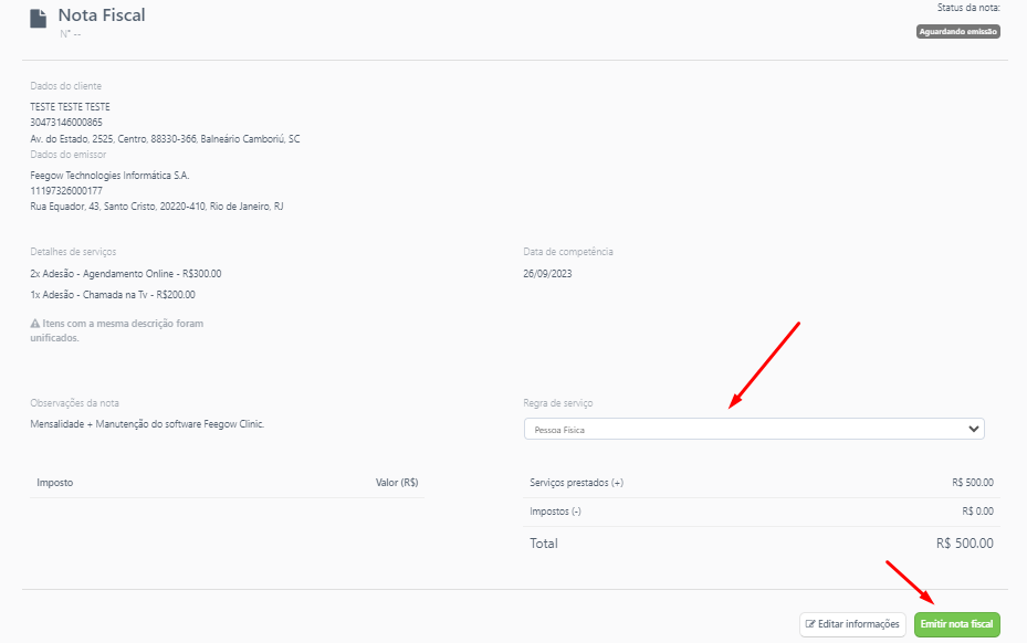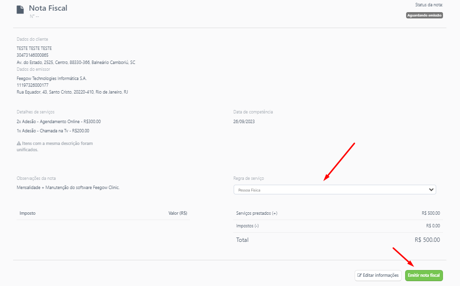 Selecione a Regra de serviço e clique em Emitir nota fiscal:
