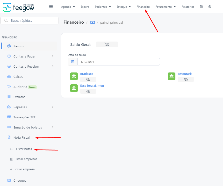 Acesse a opção de Financeiro > Nota Fiscal > Listar notas: