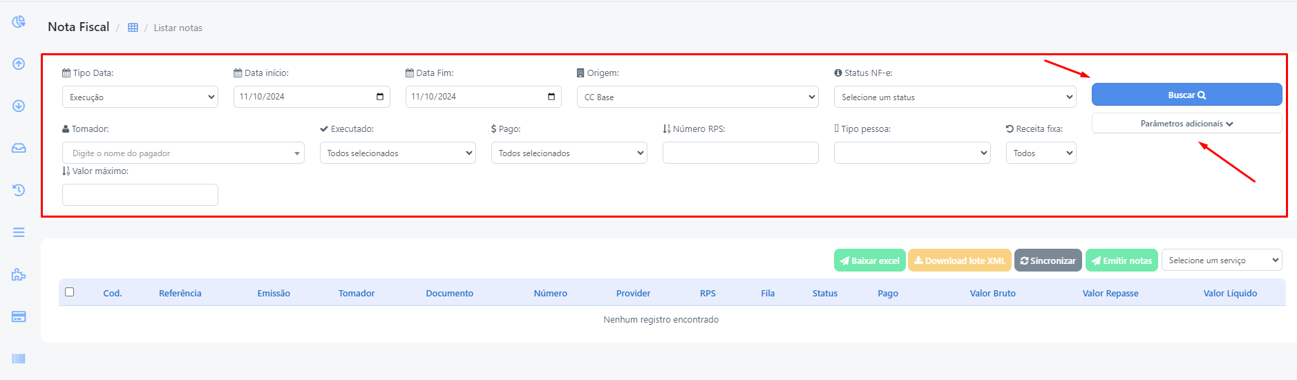 Poderá realizar a busca das notas filtrando por Tipo Data, Data início, Data Fim, Origem, Status NF-e, ou clicando em Parâmetros Adicionais, onde poderá filtrar também por Tomador, Executado, Pago, Número RPS, Tipo pessoa, receita fixa e Valor máximo em seguida clique em Buscar: