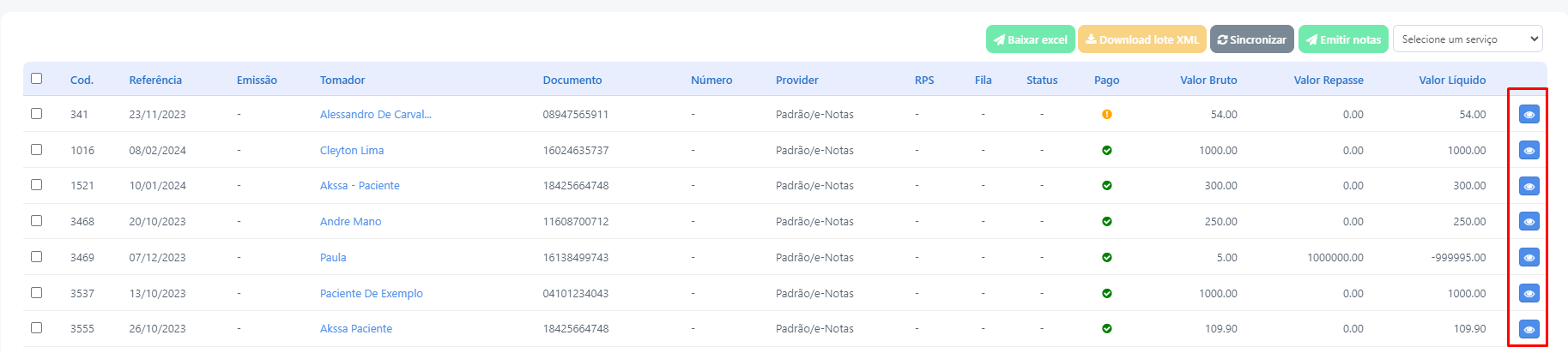 É possível gerenciar pela conta do paciente, clicando no ícone laranja conforme o passo a passo do tópico "1. Como emitir Nota fiscal pelo Conta a Receber" ou em Financeiro > Nota Fiscal > Listar notas clicando no ícone de "olho azul" conforme o passo a passo do tópico "2. Como emitir Nota fiscal pela listagem das notas":