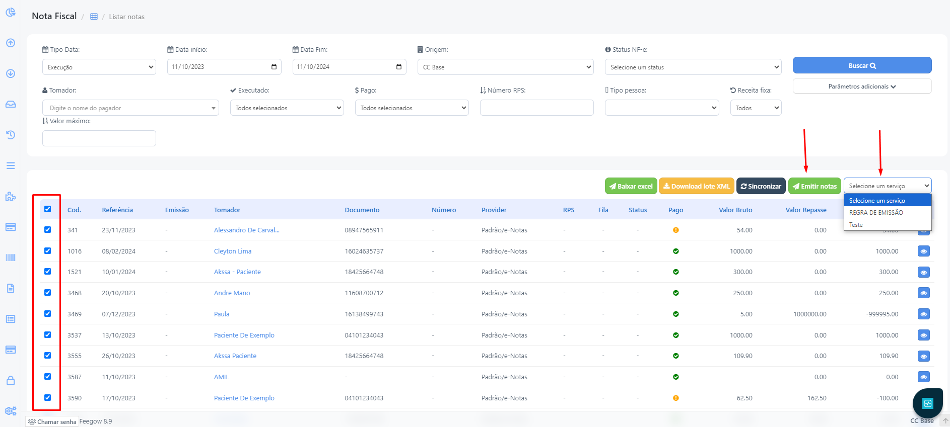 Após aplicar o filtro e buscar, selecione na listagem todas as notas que deseja gerar em lote, depois selecione a Regra de serviço e clique em Emitir notas: