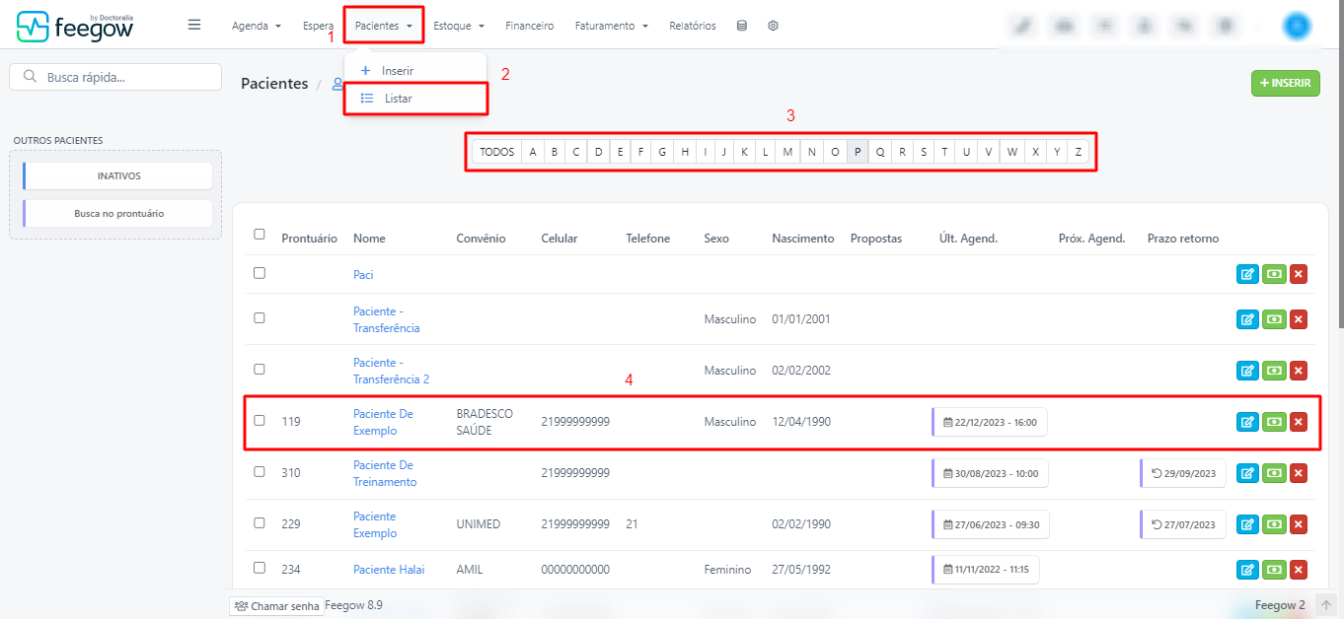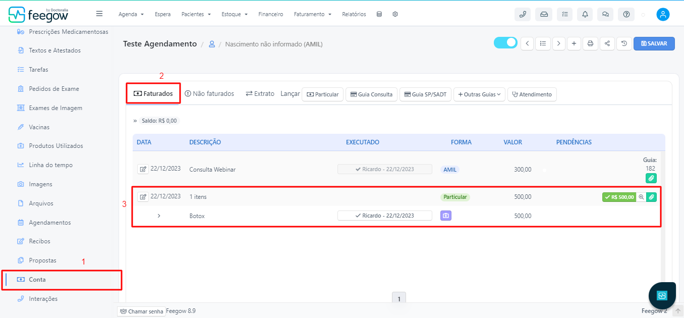 No primeiro caminho é preciso ir no cadastro do paciente > conta > faturados, como segue abaixo: