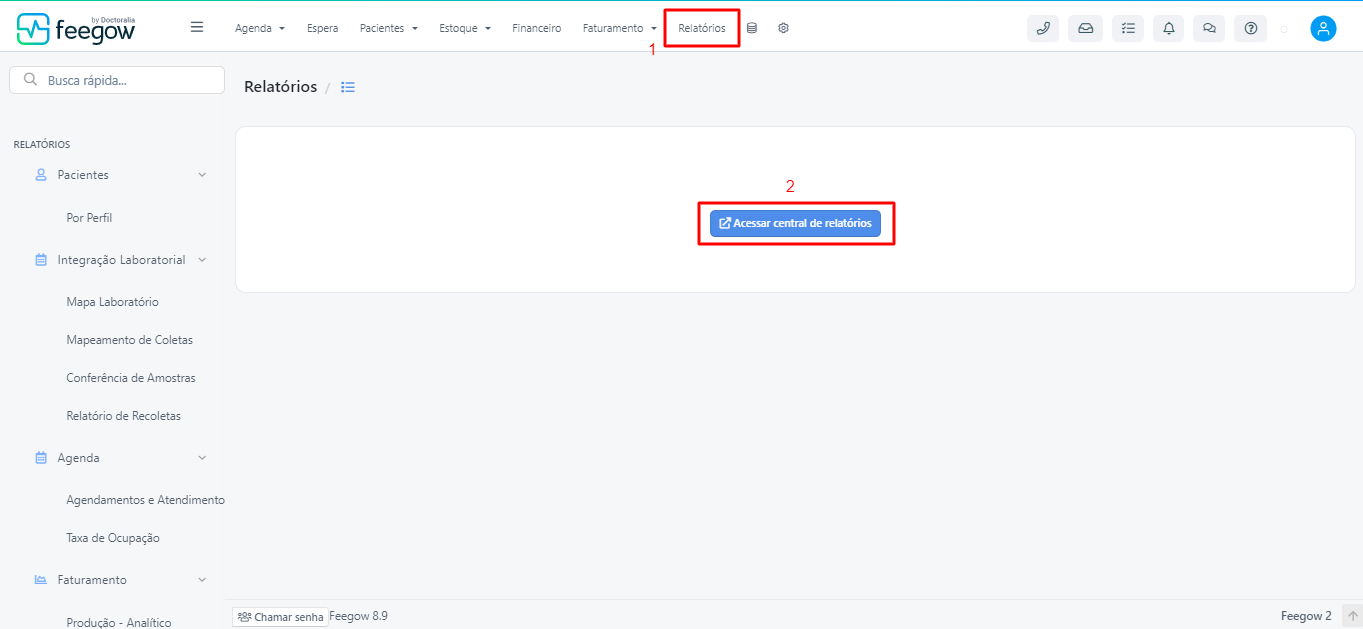 O terceiro caminho, por sua vez, é através dos relatórios do sistema. Para isso, é preciso ir em relatórios > acessar nova central de relatórios > financeiro > contas a receber. Abaixo o passo a passo: