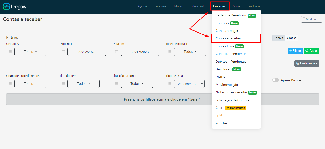 O segundo caminho é através da aba do financeiro > contas a receber > listar, como segue, após preencher os filtros de pesquisa: