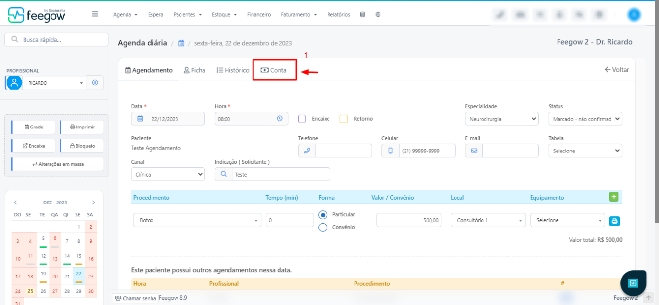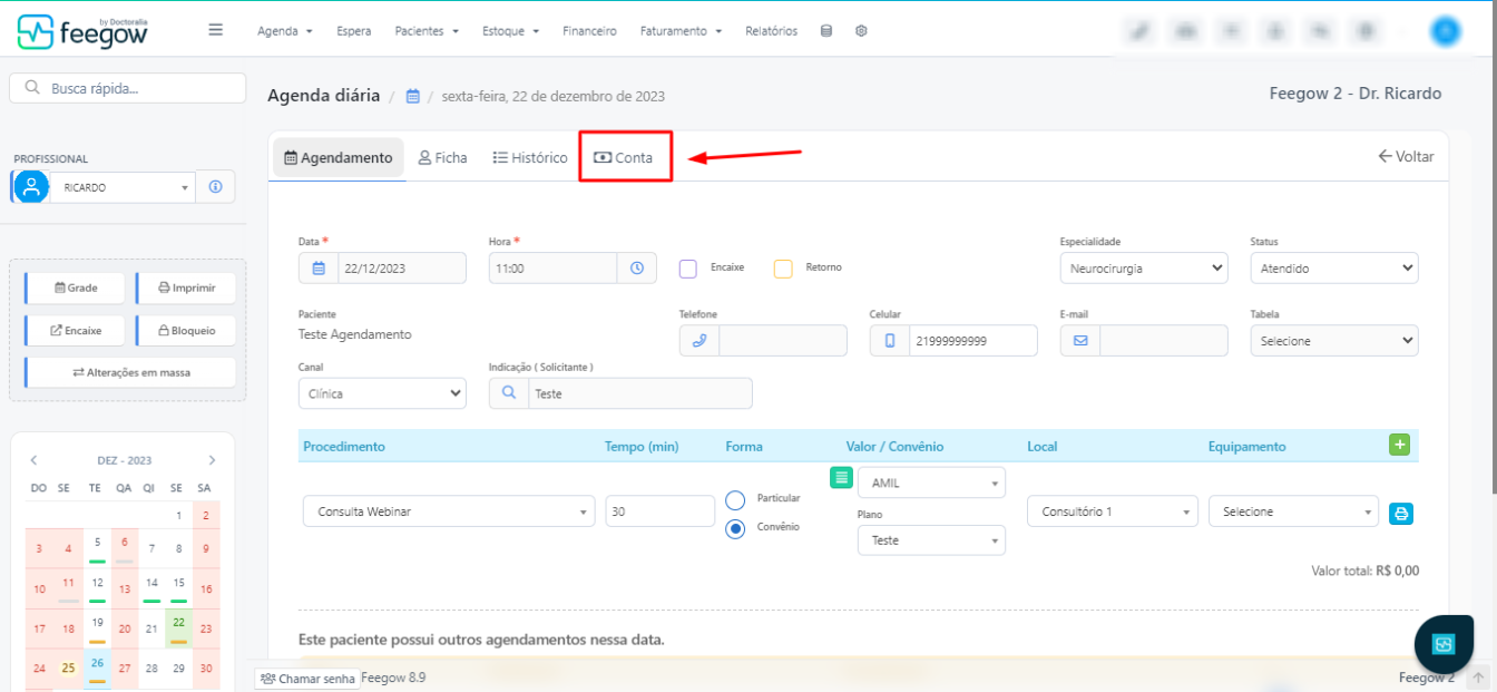 Após entrar no prontuário do paciente, basta clicar em "conta", no menu lateral.
