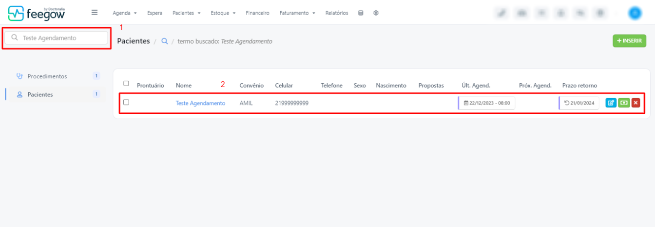 Para localizar através do agendamento, deve clicar em agenda > selecionar uma dentre as agendas disponíveis > procurar pelo nome do paciente e clicar nele, como segue abaixo: