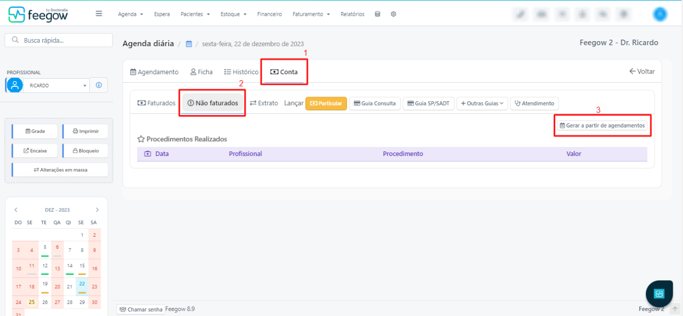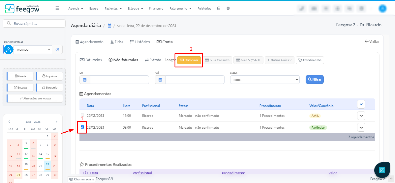 Após localizar a conta, acesse Não faturados > gerar a partir do agendamento > marcar o procedimento/agendamento > selecionar a opção de particular > salvar. Segue abaixo um exemplo da operação com todo o passo a passo: