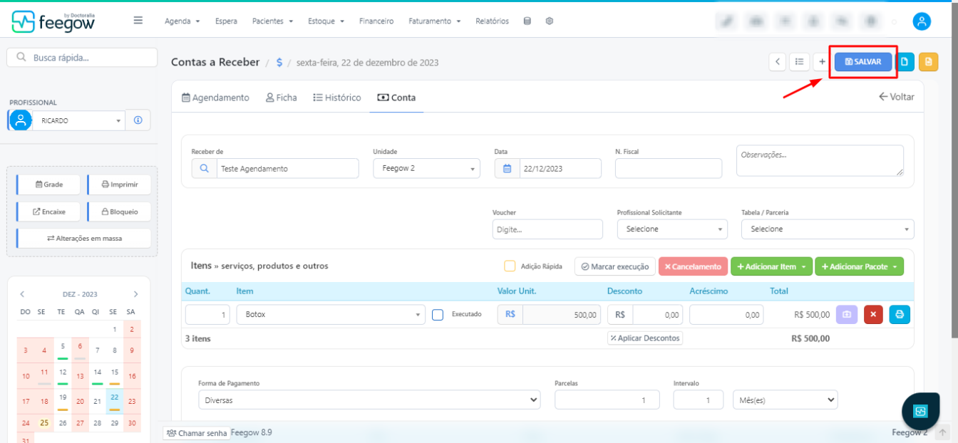 Assim, você será redirecionado para a tela da conta a receber, onde o sistema já puxará automaticamente as informações do agendamento, bastando clicar em "salvar".