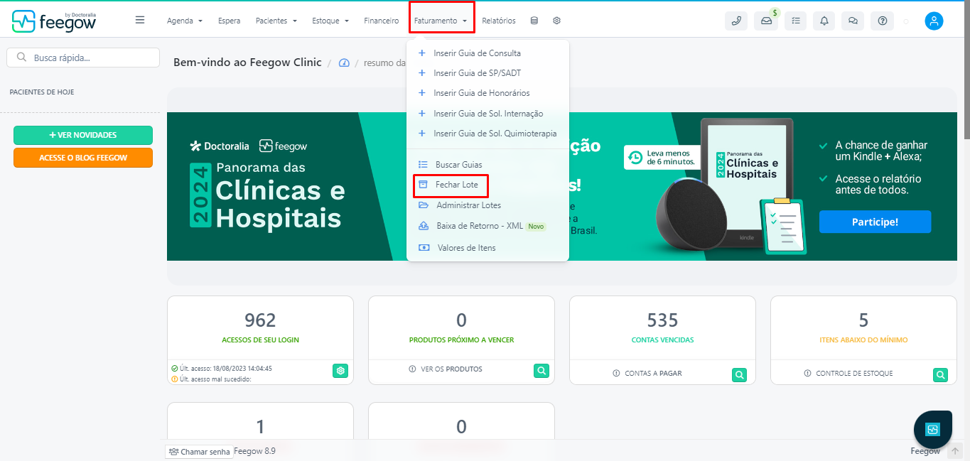 Para inserir as guias em um lote e fechar o mesmo, você deve ir em Faturamento > Fechar lote.