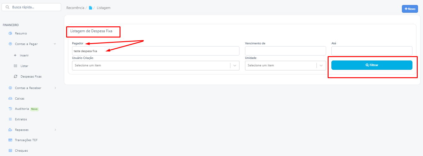 Na tela de despesas fixas, busque pelo pagador (fornecedor, paciente, etc.) e clique em Filtrar para encontrar a despesa que deseja editar.
