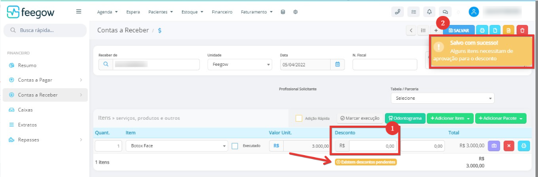 No exemplo, é possível observar um caso em que um desconto necessita de aprovação após o aplicar na conta a receber