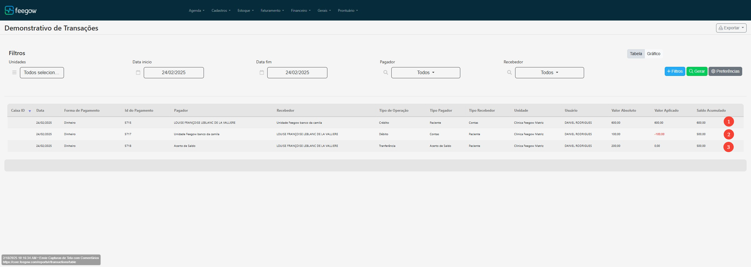 1: É uma conta A RECEBER paga pela paciente Louise o valor é de R$ 600,00, o valor aplicado é de R$ 600,00, pois foi quanto ela pagou, e o "saldo" é de R$ 600,00.