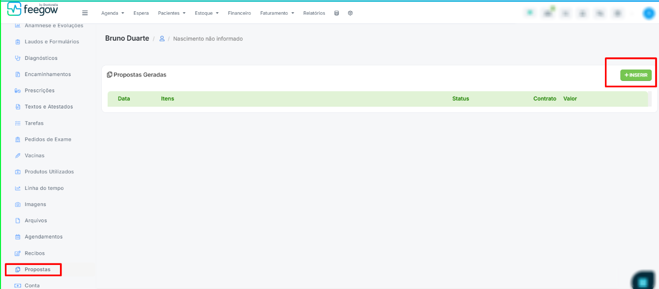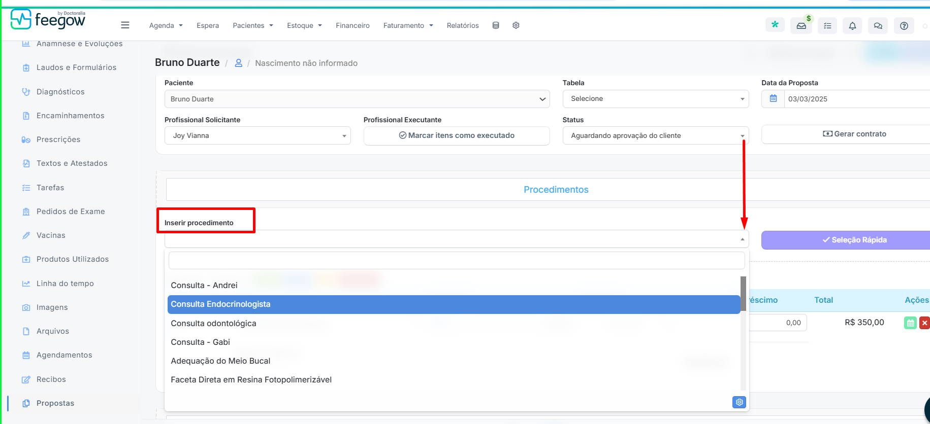 Dentro do prontuário do paciente, clique em proposta, inserir e selecione os procedimentos que deseja.