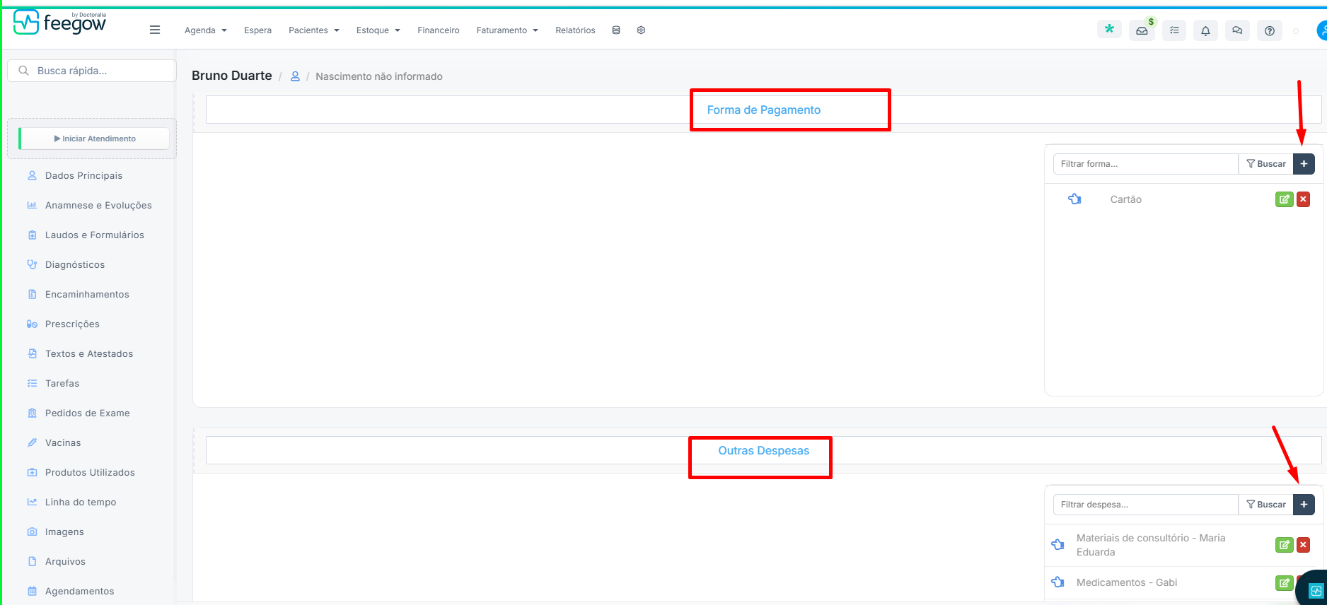 Na opção Forma de pagamento, é possível inserir a forma de pagamento acordada, o que facilita uma melhor negociação com o paciente. Além disso, é possível adicionar outras despesas relacionadas ao atendimento. Basta clicar nos sinais de mais (+) e preencher com as informações desejadas.