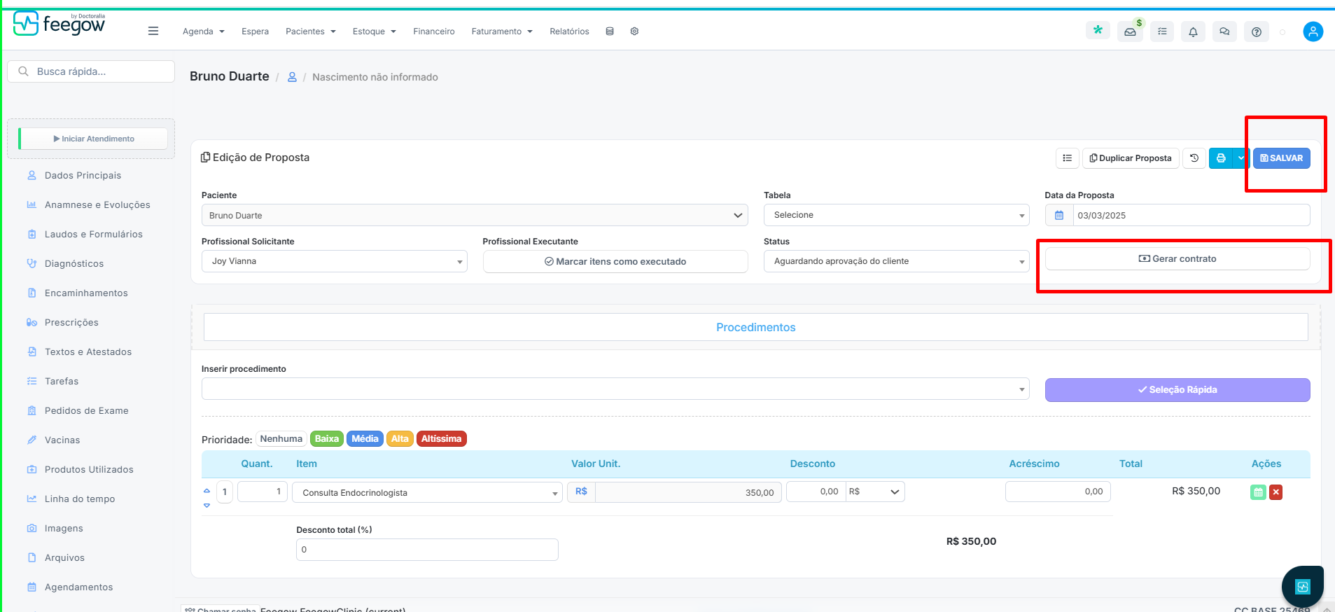 Após inserir o procedimento na proposta, clique no botão salvar e depois em gerar contrato