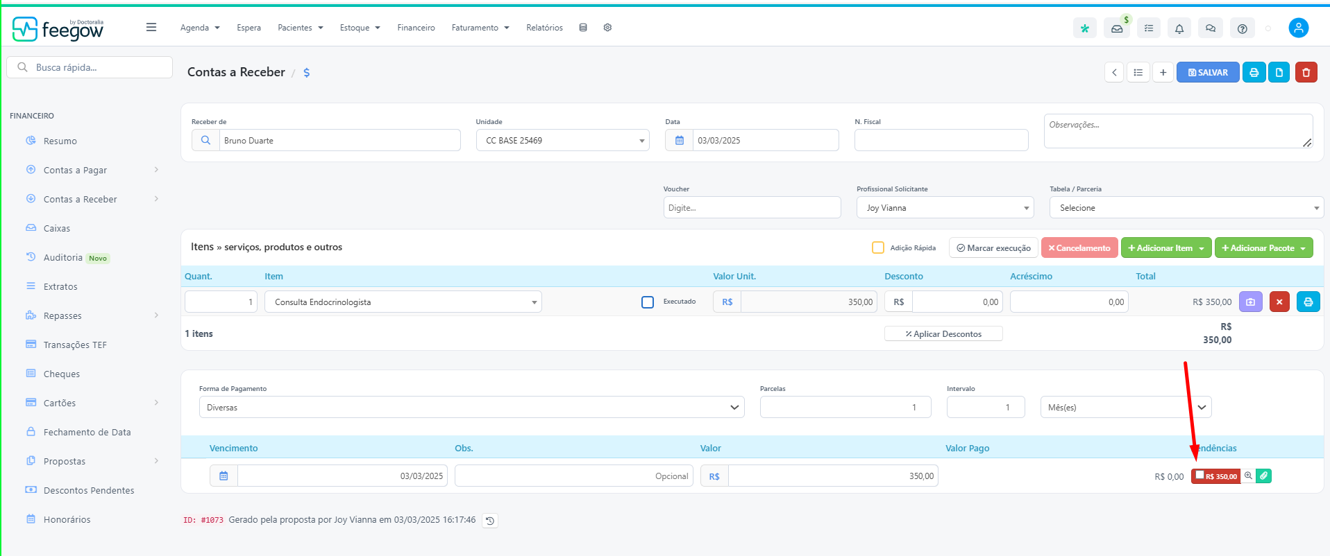 Nessa tela, é possível realizar o pagamento caso o paciente queira antecipar o pagamento ou realizar alguma edição se necessário.
