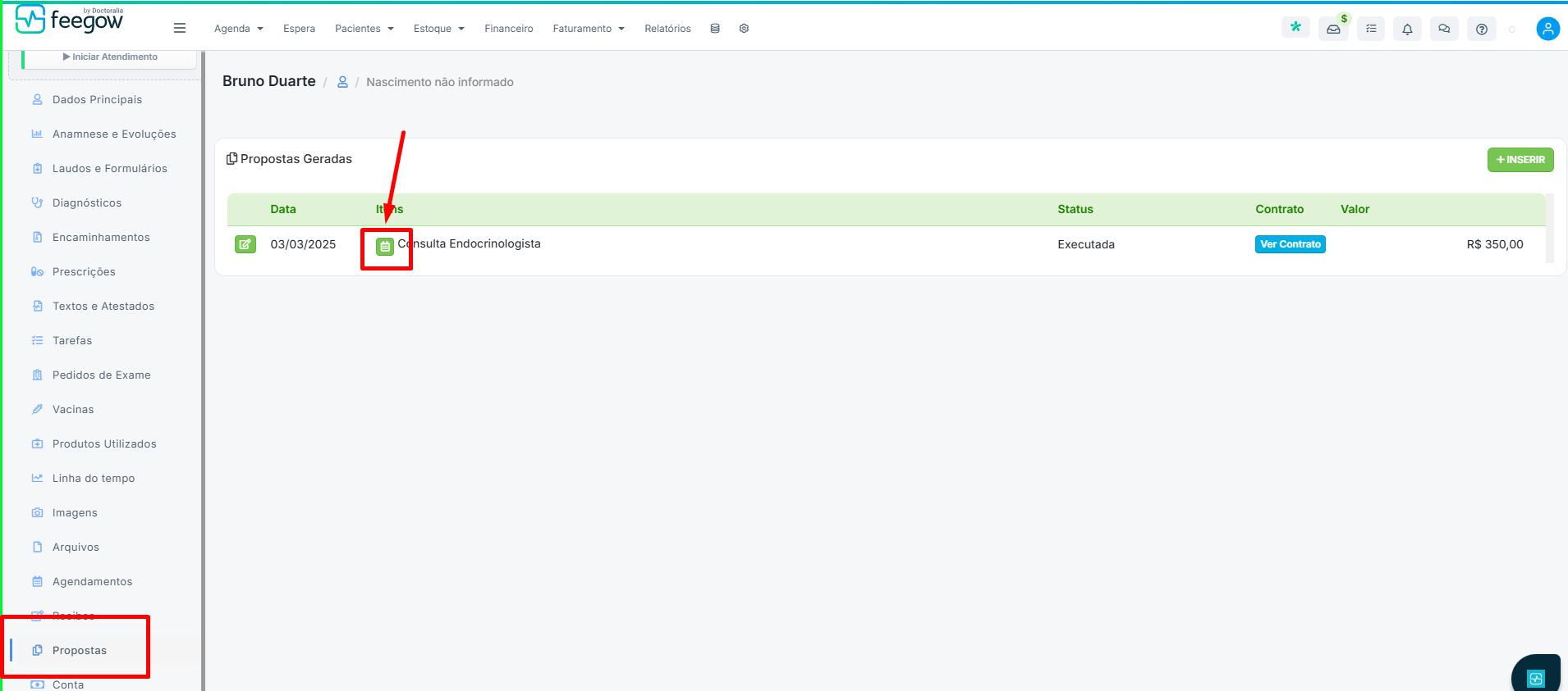 Acesse o prontuário do paciente, clique em proposta para visualizar as propostas geradas e clique no ícone do calendário.