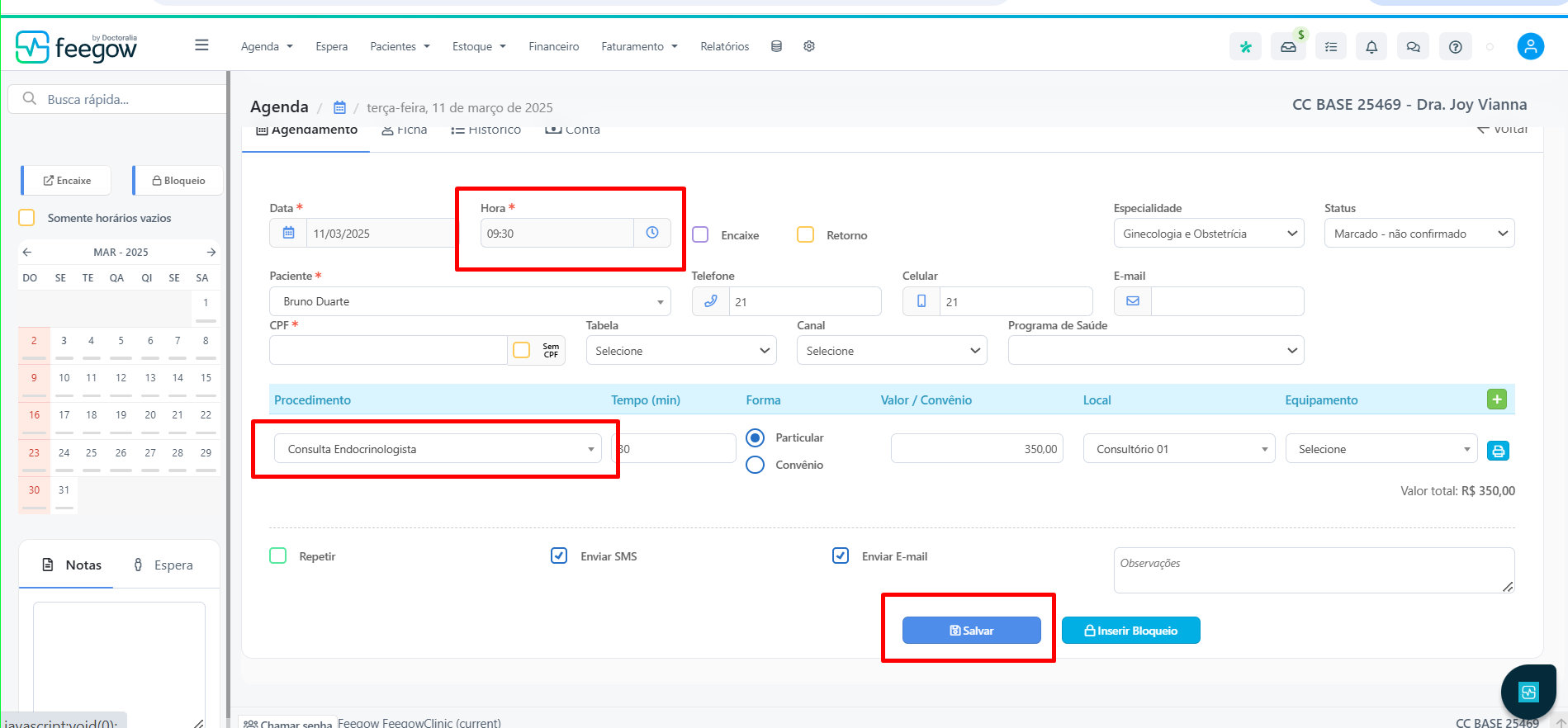 Após selecionar o horário desejado, será redirecionado para a tela de agendamento, onde o sistema já puxa automaticamente o nome do paciente, procedimento, valor, etc.