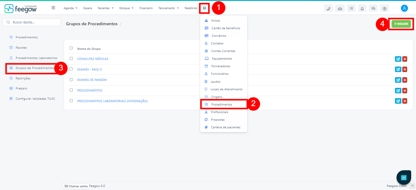 Entre em Cadastros > Procedimentos > Grupos de Procedimentos > Inserir.