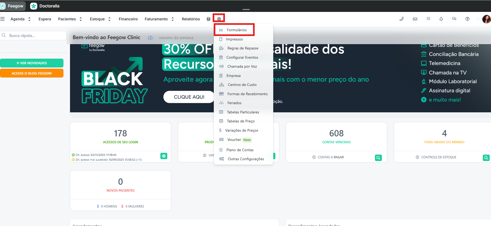 1. No menu lateral do Feegow, clique em Configurações > Formulários.