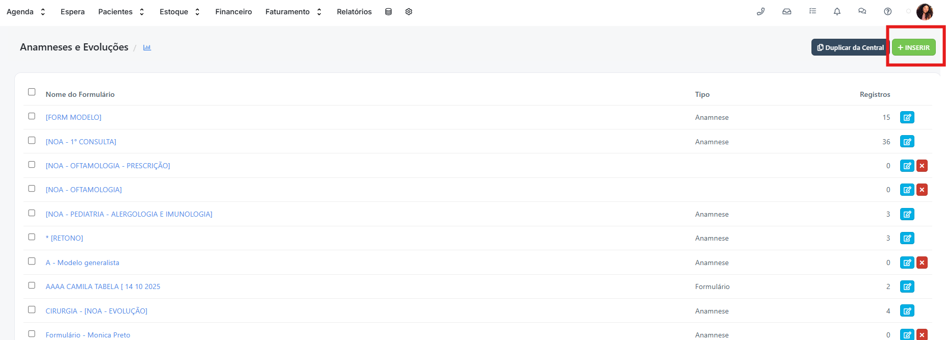 Clique em INSERIR para criar um novo Formulário, ou edite um já existente.