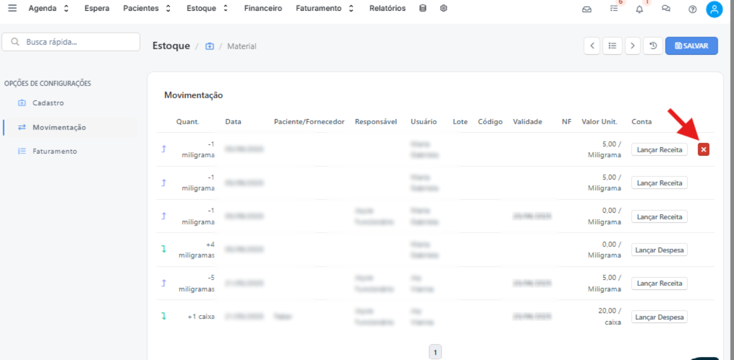 Na lista de movimentações, exclua a última saída registrada (identificada pela seta roxa para cima) clicando no ícone “X".