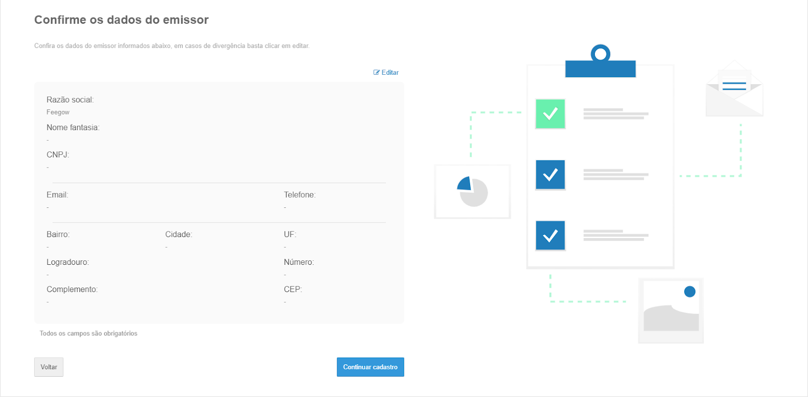 ● Confira os dados do emissor, caso exista alguma informação divergente ou incompleta basta clicar no botão de editar e inserir os novos dados.