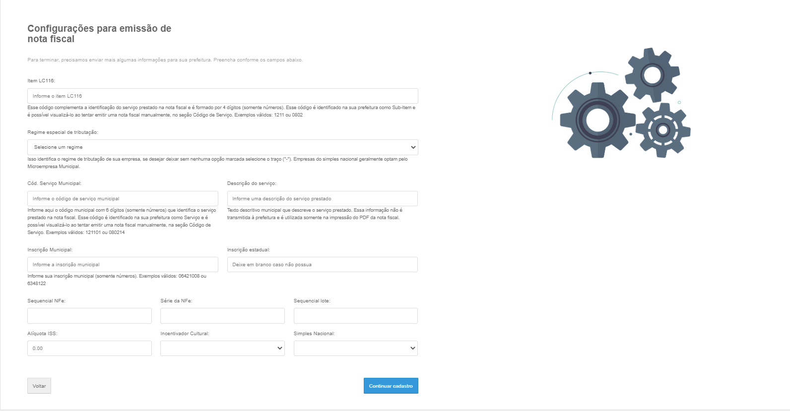 ● O último passo consiste em todas as informações necessárias para configuração da emissão, lembrando que todos os campos são obrigatórios. Caso a prefeitura disponibilize, uma descrição com breve explicação será mostrada abaixo do campo.