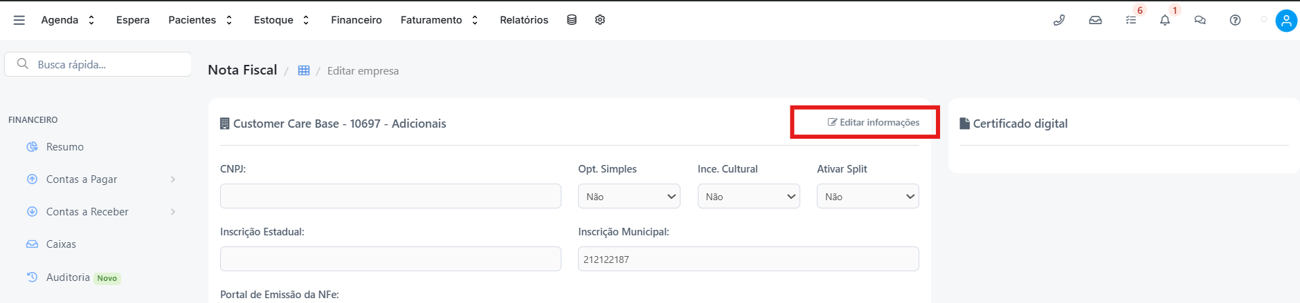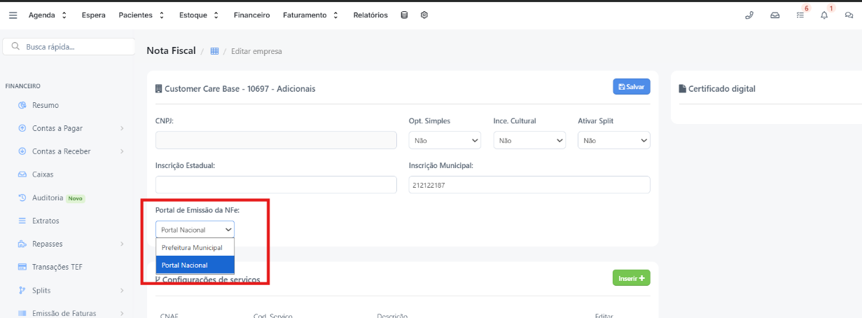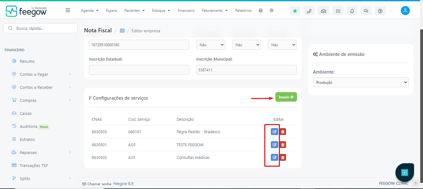 No entanto, para fins de integração e emissão de notas fiscais dentro do sistema Feegow, é obrigatório o preenchimento do campo de Inscrição Municipal no cadastro da clínica/profissional.