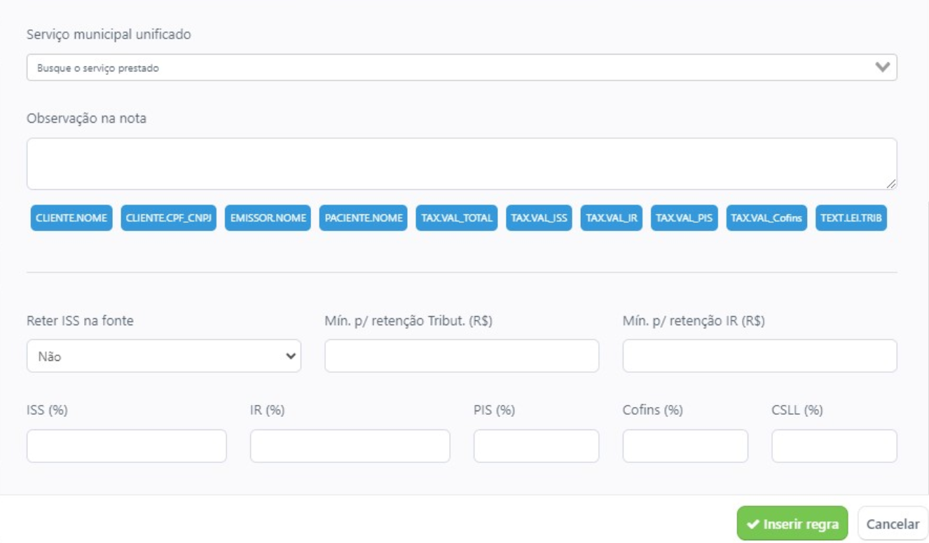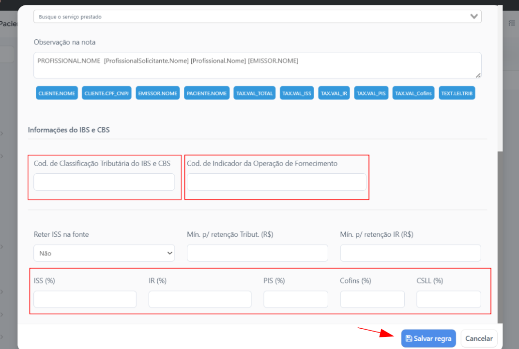 Caso a clinica tenha informações de tributos, preencha também os campos de ISS, IR, PIS, CONFINS e CSLL.
