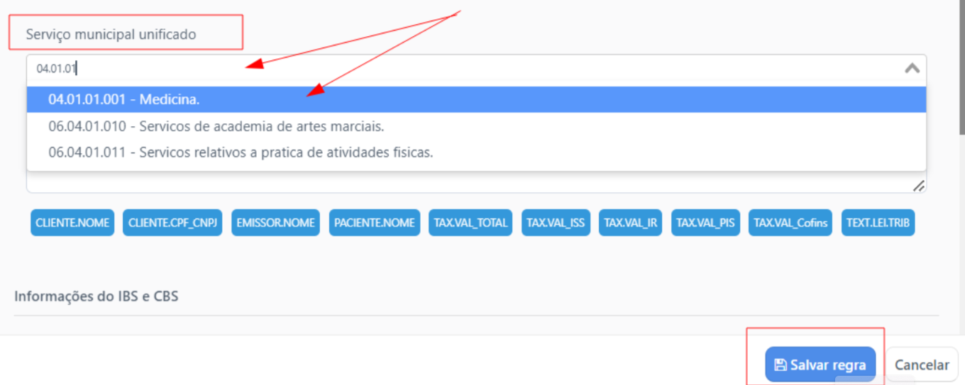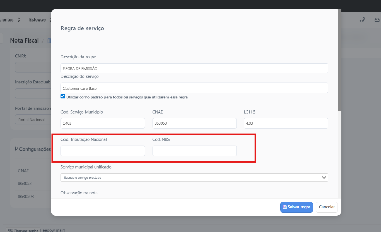 Após salvar e confirmar as informações, acesse a regra de serviço e inclua os códigos necessários conforme a condição da prefeitura local.