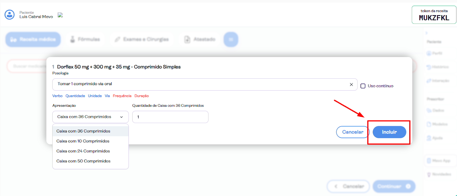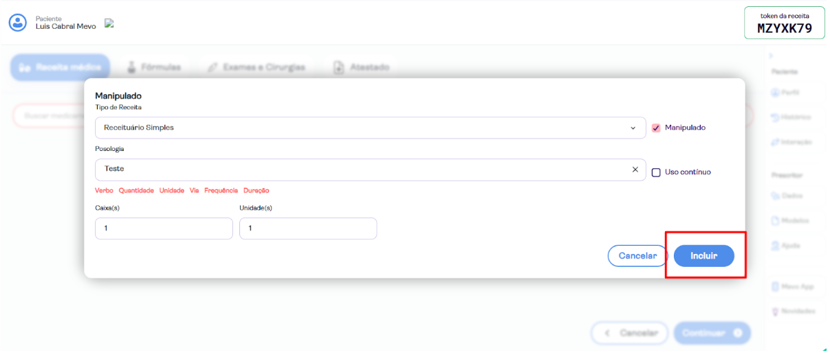 - Incluir na receita: após revisar as informações, clique em “Incluir” para adicionar o medicamento à prescrição.