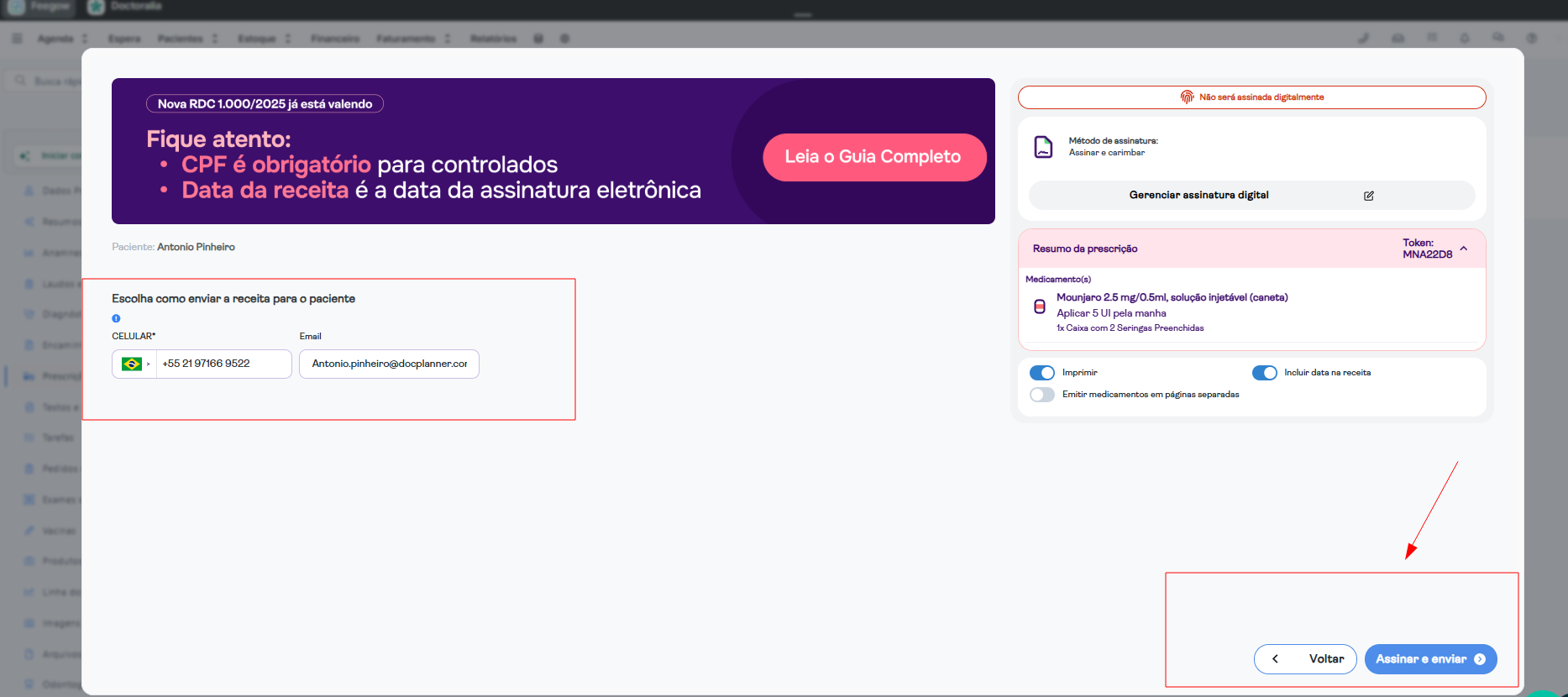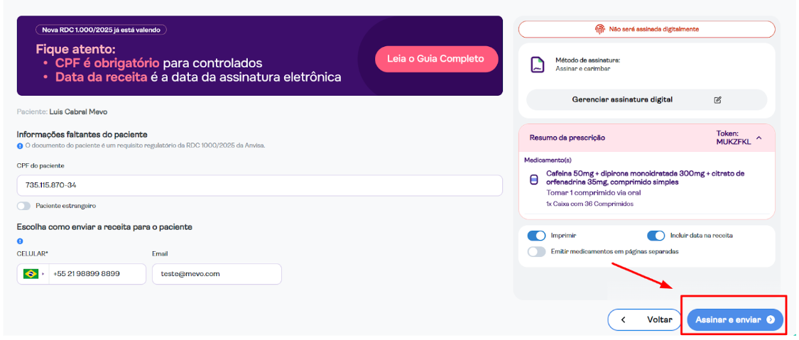 - Caso necessário, preencher os dados faltantes do paciente para viabilizar o envio da prescrição digital;