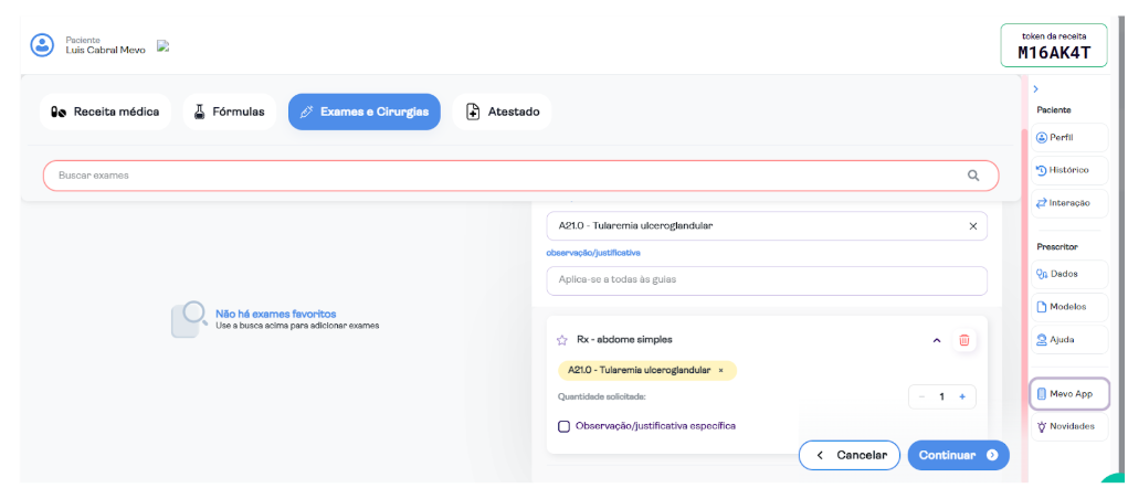 O processo de criação de um pedido de exame pela Mevo tem início dentro do prontuário do paciente, garantindo que todas as informações estejam centralizadas e vinculadas ao atendimento em andamento, com mais segurança e rastreabilidade.